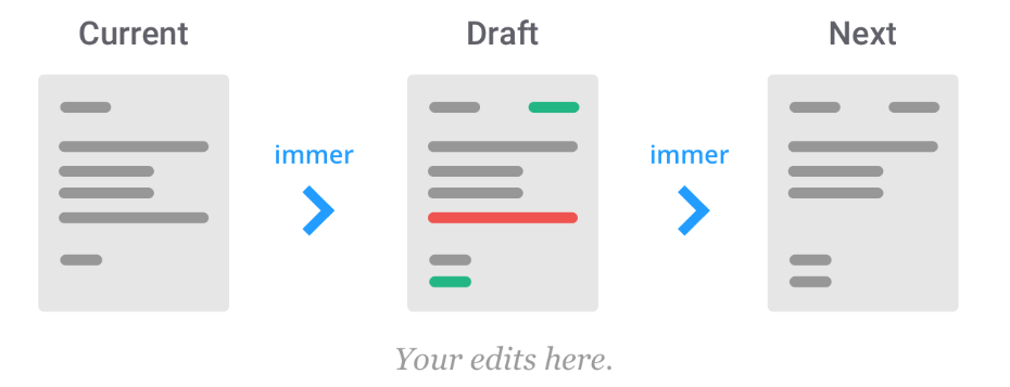 기본 원리는 immer를 사용하여 모든 변경 사항을 currentState의 프록시인 임시 초안(draft)에 적용할 수 있다는 것이다.